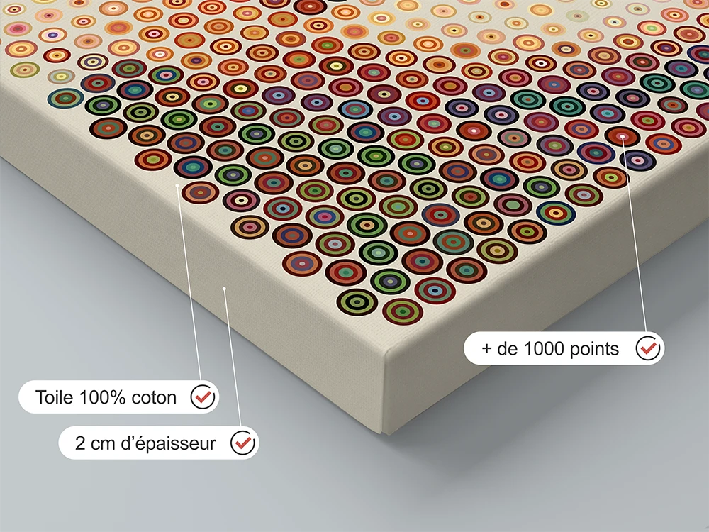 Tableau imprimé sur de la toile 100% coton 380 gr. finition mate, tendue sur un châssis en bois et ajustée avec des clés de tension. Votre tableau est déjà prêt à être directement accroché à votre mur, en vous évitant de prévoir l'achat d'un cadre ou d'attache quelconque.