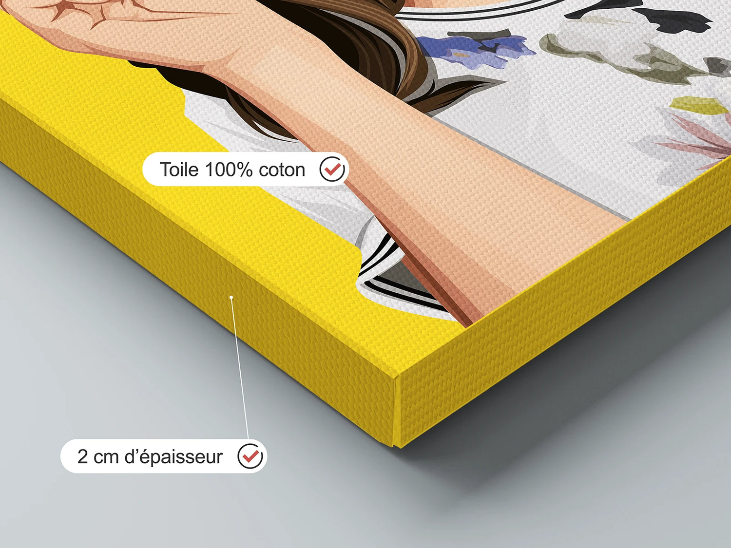 Tableau imprimé sur de la toile 100% coton 380 gr. finition mate, tendue sur un châssis en bois et ajustée avec des clés de tension. Votre tableau est déjà prêt à être directement accroché à votre mur, en vous évitant de prévoir l'achat d'un cadre ou d'attache quelconque.
